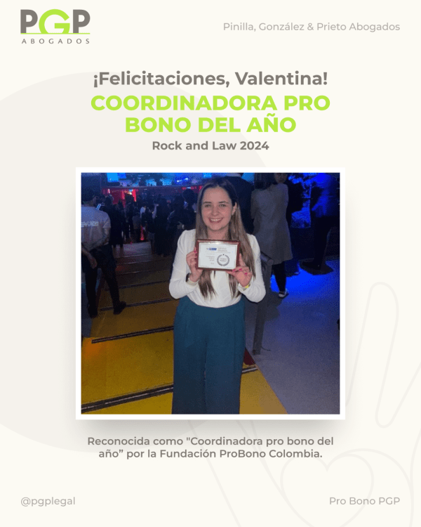 Con gran orgullo anunciamos que Valentina Almonacid, abogada junior del área de Derecho Corporativo, ha sido distinguida con el premio "Coordinadora pro bono del año" por la Fundación ProBono Colombia durante el evento Rock and Law 2024, el cual se llevó a cabo ayer, 17 de octubre, en Bogotá.